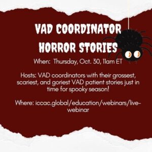 A few weeks ago, an LVAD patient forwarded me a Halloween-themed social media post from the International Consortium of Circulatory Assist Clinicians (ICCAC) – an organization of VAD coordinators who administer the VAD-C exam. The post describes a virtual gathering for VAD coordinators to share “their grossest, scariest, and goriest VAD patient stories.”